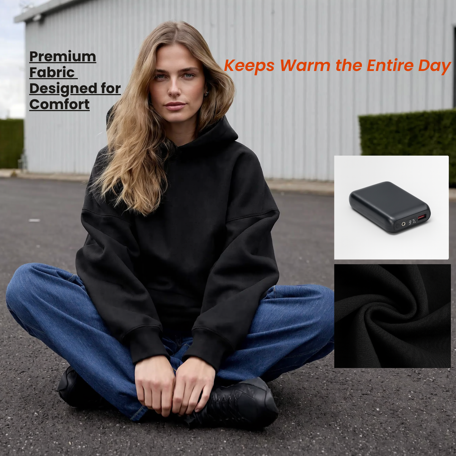The rechargeable 7.4 V battery keeps your hoodie heated for hours: around 3–4 hours on high, 5–6 hours on medium, and up to 8 hours on low. You can even use the same battery as a power bank to charge your phone on the go.